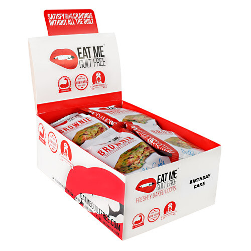 Calories 190 Total Fat 6g 8 DV Sat. Eat Me Guilt-Free High Protein Brownie - Birthday Cake Eat Me Guilt Free SKU. Eat me guilt free created a buttery confetti filled birthday cake flavor that makes you feel like it is your birthday all year long.